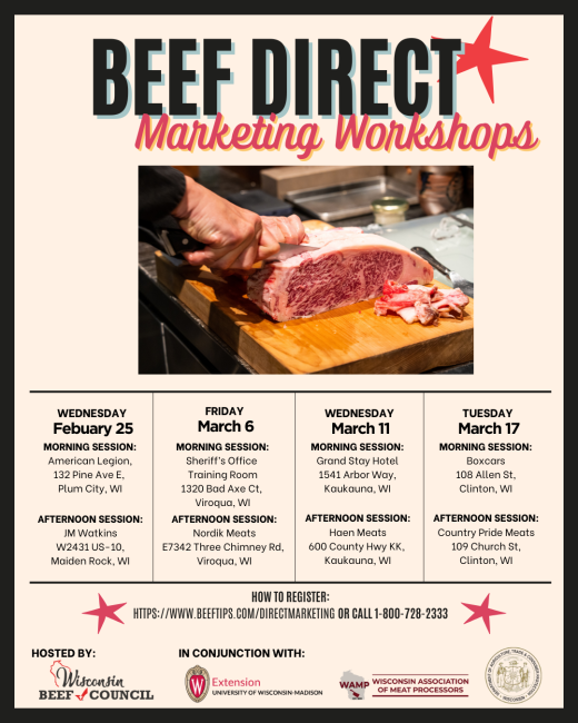 The workshops are offered by the Wisconsin Beef Council and are being held in conjunction with the Wisconsin Association of Meat Processors, UW-Madison Division of Extension, and the Wisconsin Department of Agriculture.